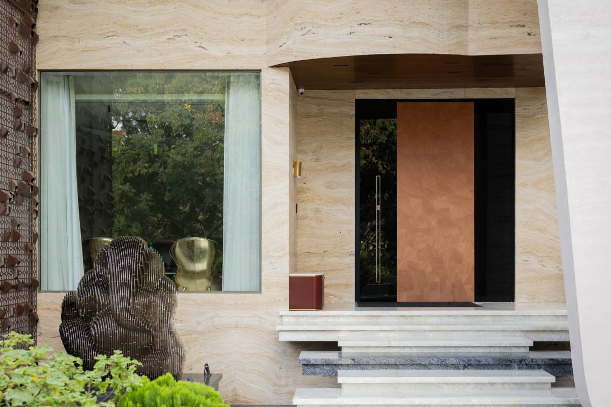 This stunning pivot door features elegant sintered stone in Abu Dhabi White edition, complemented by five-layer decorative tempered glass with a striking Pirnar Grey II motif. The sophisticated handle incorporates SmartLux illumination and PVD coating Copper Dusk, while the SecuroSmart finger scanner and Armo Comfort Electro system ensure enhanced security.