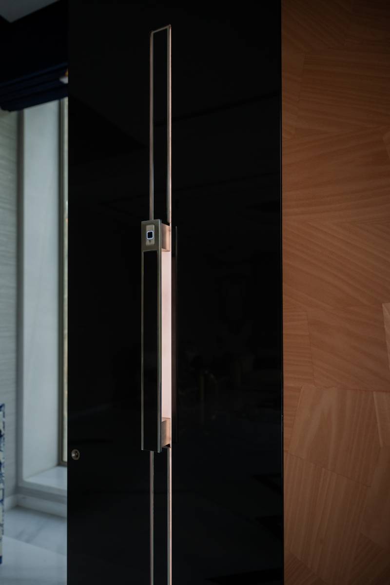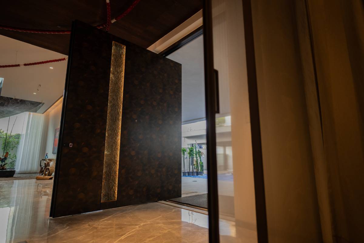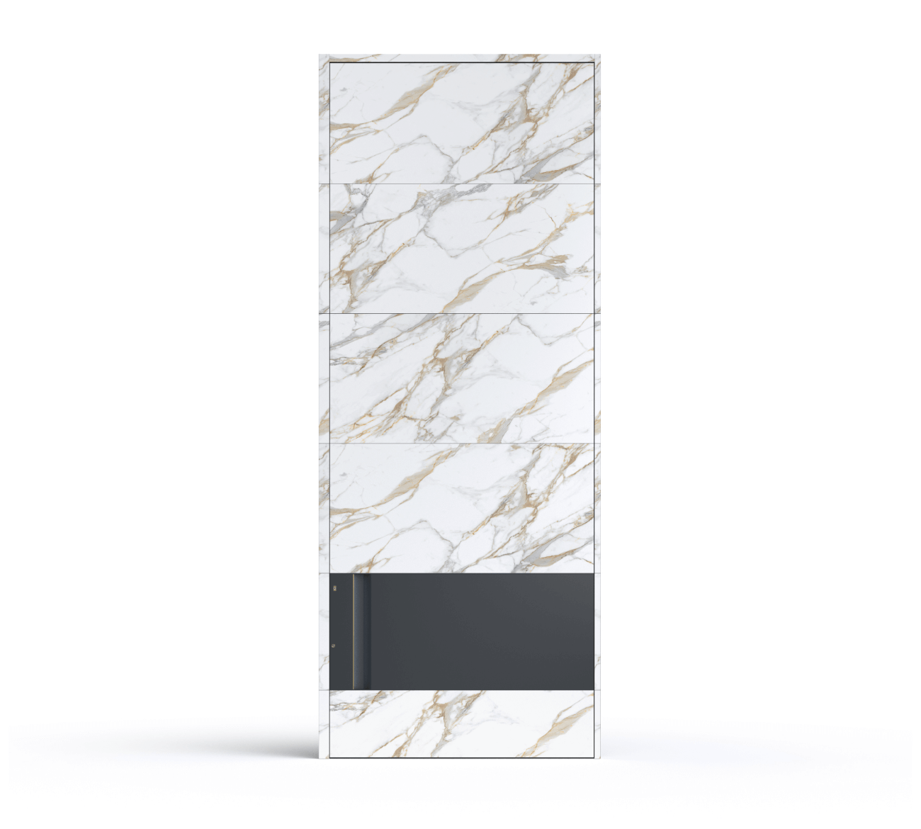 This captivating pivot door is crafted from luxurious sintered stone in Mont Blanc edition, seamlessly paired with decorative tempered glass in Night Sky Gloss and a PVD coating Volcanic Shadow. Featuring a recessed handle with SmartLux illumination, it also includes a SecuroSmart finger scanner complemented by the Omnilock locking system for optimal security.