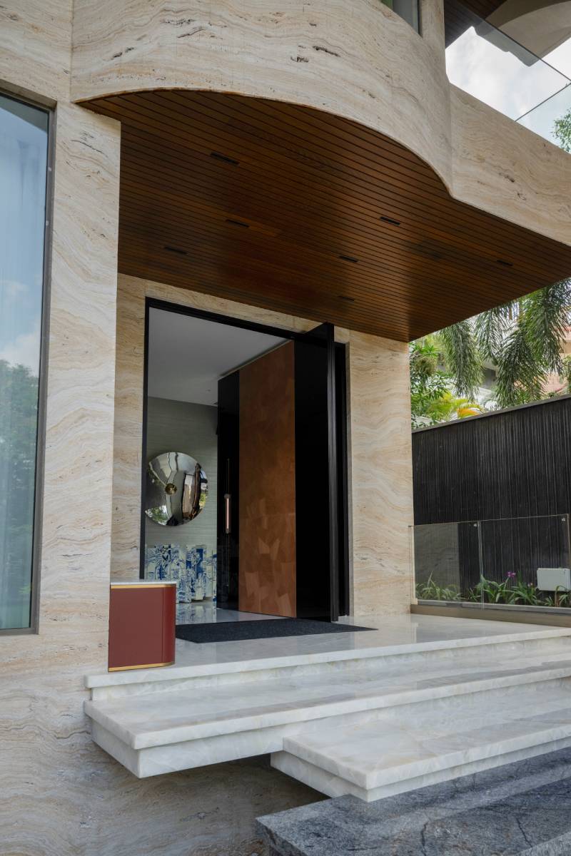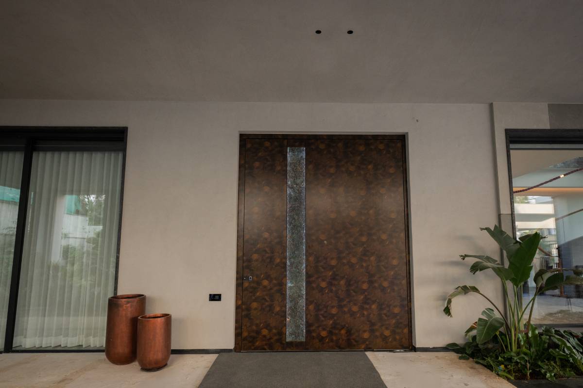 Pirnar pivot doors offer a wide selection of premium materials such as sintered stone, colors, wood decors, and concrete and Corten steel imitations, enabling virtually unlimited design possibilities for the most demanding homeowners.