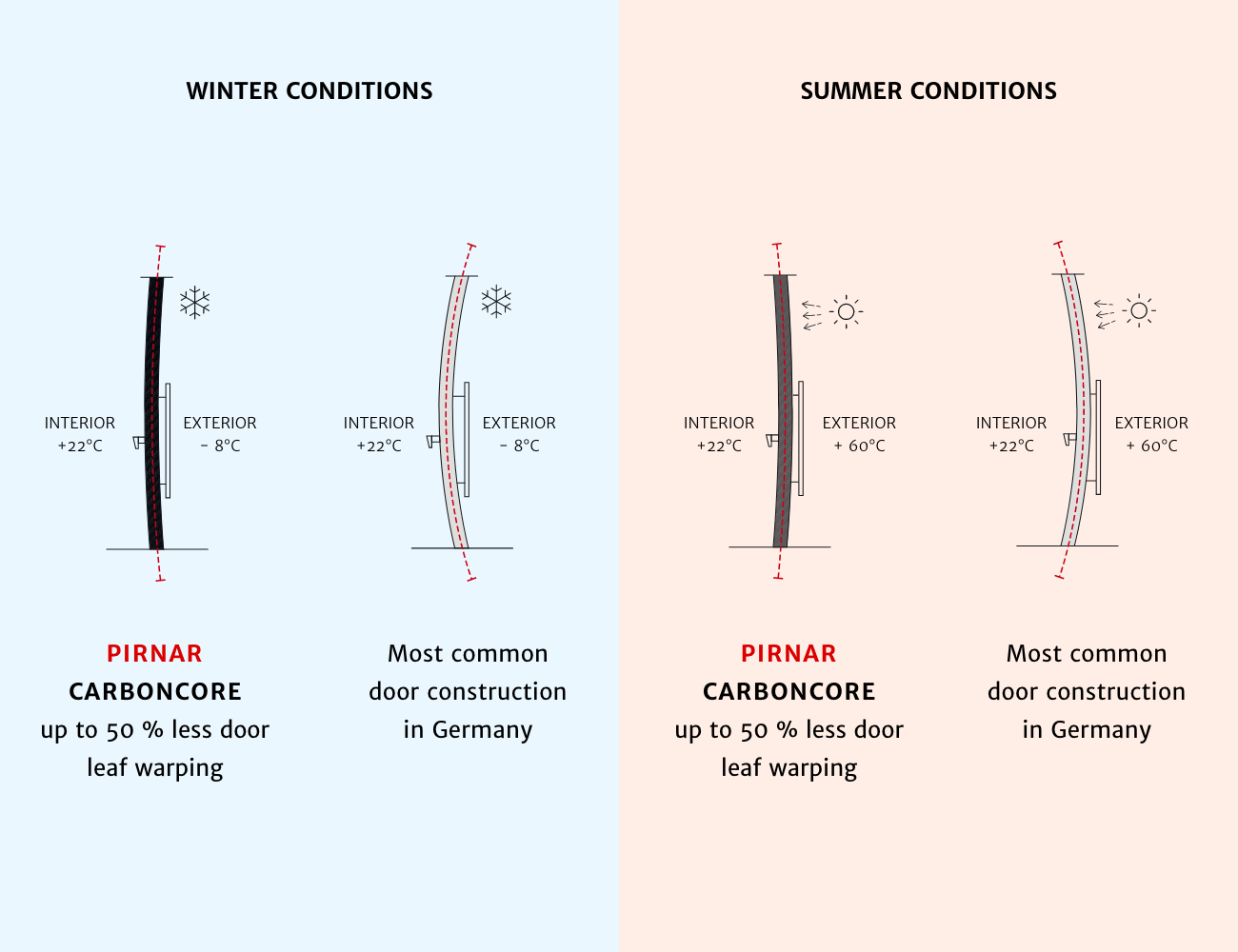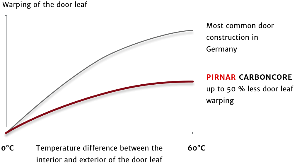 Our unique CarbonCore construction ensures exceptional stability, even for doors with extraordinary dimensions. Laboratory tests confirm up to 50% less door leaf warping caused by temperature differences compared to conventional constructions. This makes Pirnar pivot doors the perfect choice for all climate conditions – from cold alpine regions to hot Mediterranean and desert environments.