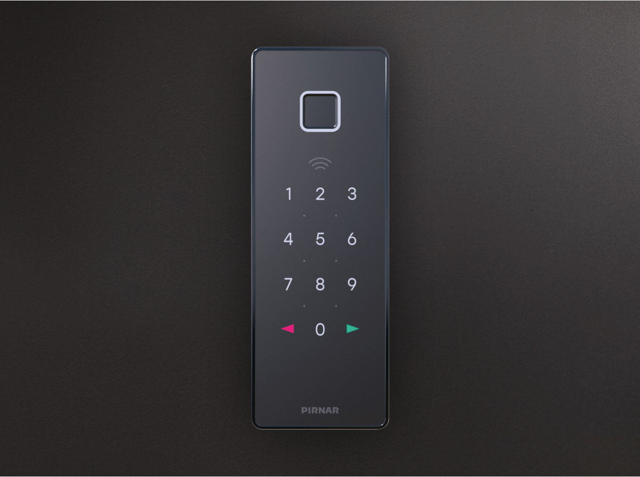 The modern keypad allows for unlocking with various PIN codes tailored to specific needs and unlocking with an NFC card. It features a finger scanner and integrated and wireless doorbell, managed via the Pirnar app.