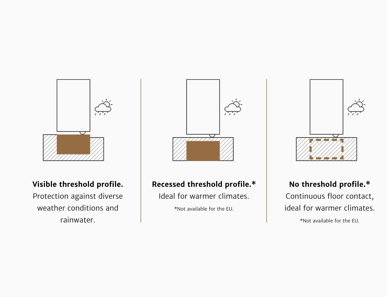Pirnar pivot doors offer various types of thresholds tailored to different climate conditions. A visible profile for more demanding climates ensures reliable protection against weather and rain, while in warmer regions, a recessed profile or a threshold-free design is ideal, allowing seamless floor contact and perfect aesthetic purity.
